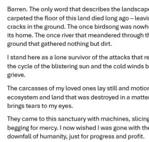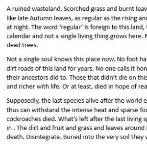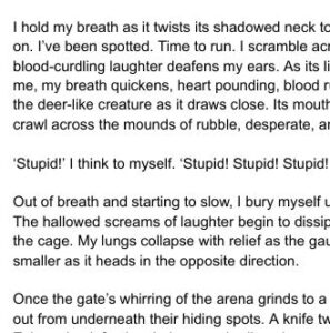 I hold my breath as it twists its shadowed neck towards the remnants of the building I stand on. I’ve been spotted. Time to run. I scramble across the rubble as the creature’s blood-curdling laughter deafens my ears. As its limbs threaten to clutch what little is left of me, my breath quickens, heart pounding, …