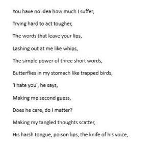 You have no idea how much I suffer, Trying hard to act tougher, The words that leave your lips, Lashing out at me like whips, The simple power of three short words, Butterflies in my stomach like trapped birds, ‘I hate you’, he says, Making me second guess, Does he care, do I matter? Making …