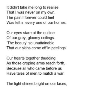 It didn’t take me long to realise That I was never on my own. The pain I forever could feel Was felt in every one of our homes. Our eyes stare at the outline Of our grey, gloomy ceilings. ‘The beauty’ so unattainable That our skins come off in peelings. Our hearts together …