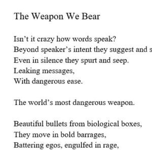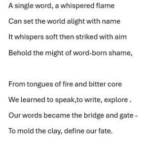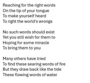 Reaching for the right words On the tip of your tongue To make yourself heard To right the world’s wrongs No such words should exist Yet you still wish for them to Hoping for some miracle To bring them to you Many others have tried To find these searing words of fire But …