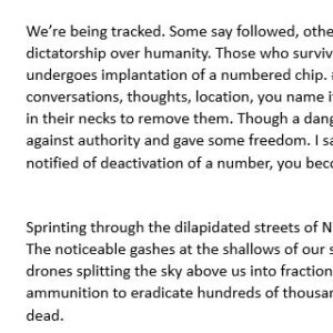 We’re being tracked. Some say followed, others call it haunting, all ways to ensure ultimate dictatorship over humanity. Those who survived the war at least. At birth, everyone undergoes implantation of a numbered chip. #3859 for example. It monitors everything, conversations, thoughts, location, you name it. That was until people began gauging cavities in their …